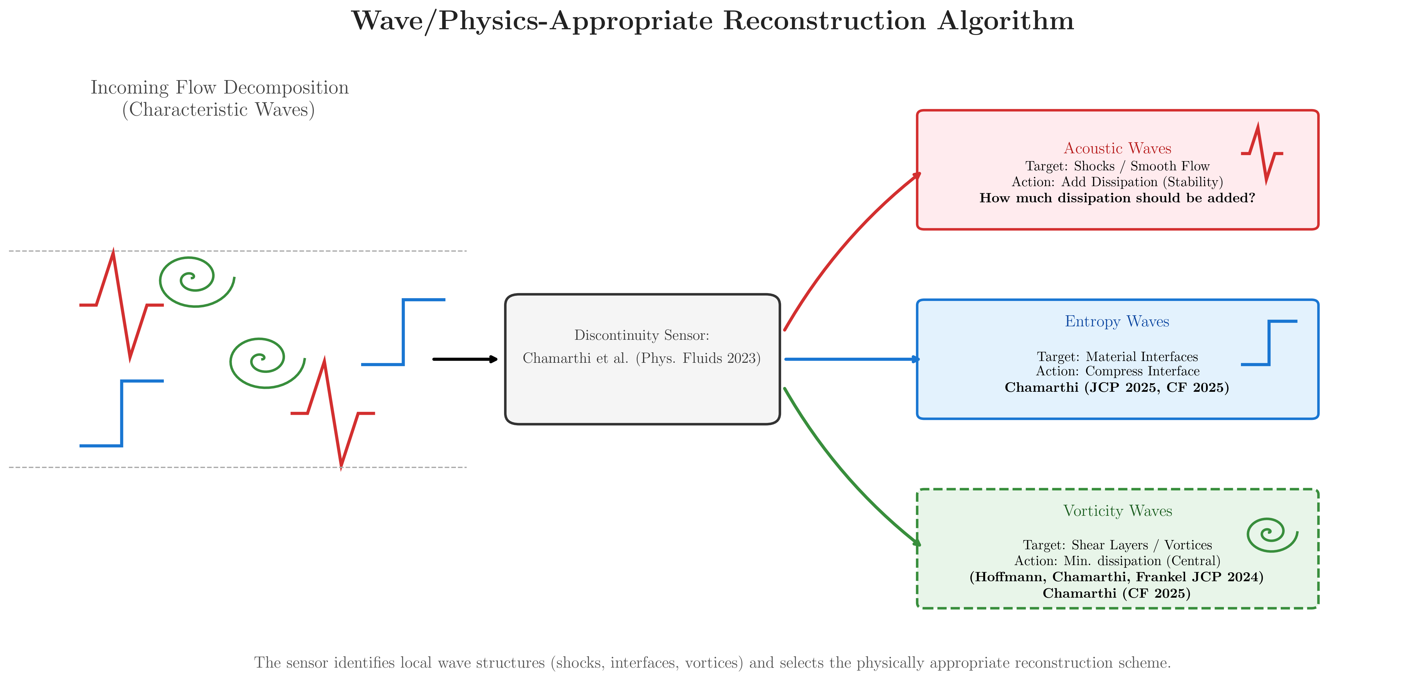 My research develops wave-appropriate numerical methods — physics-informed reconstruction schemes that treat vortical, entropy, and acoustic wave families according to their distinct physical character, rather than applying a single scheme uniformly.